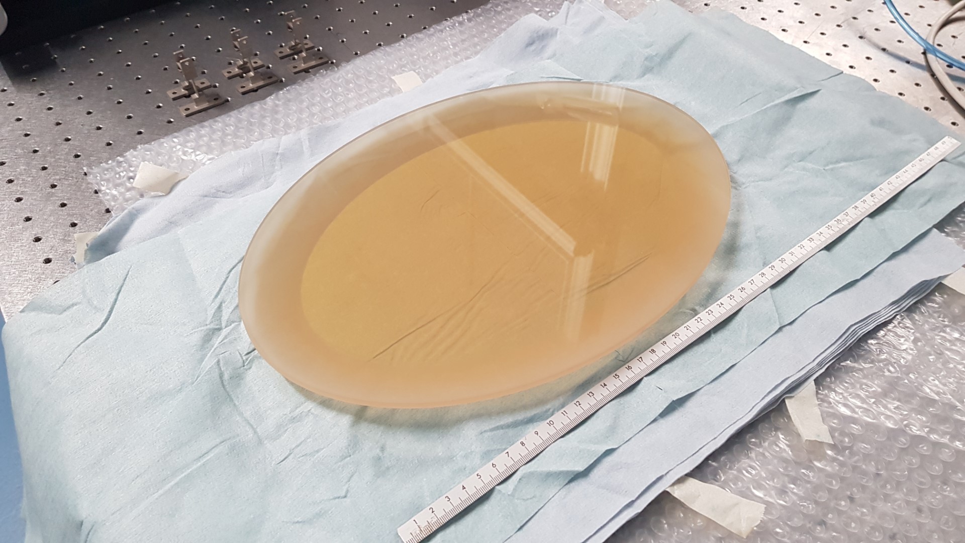 The final support pads to be glued onto the surface are still being manufactured: these will be made out of Invar material which does not change shape with temperature changes (only tiny fractions of a milimetre can impact the mirror surface). Therefore, aluminium pads are being used as placeholders in the meantime as it is important we test the physical effects of the pads on the mirror surface and whether the glue for the pads will warp the surface of the mirror during polishing and measuring.