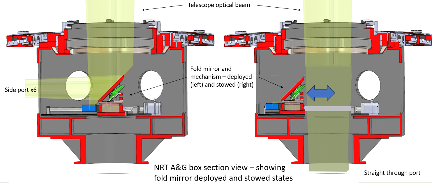 Schematic diagram showing the acquisition and guidance box section view with the science fold mirror in deployed and stowed states.