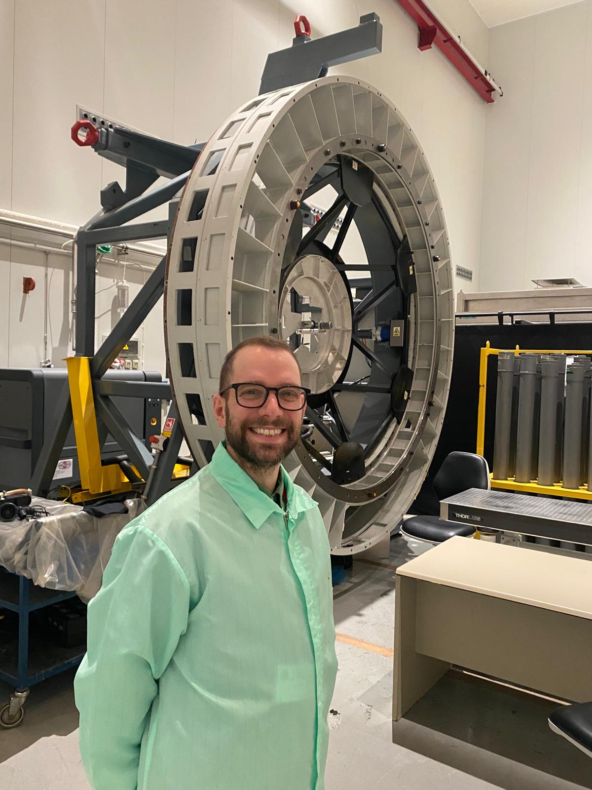 Dave Copley, systems engineer for LJMU, admires the IAC equipment. In particular (right hand image) the science fold (tertiary) mirror for NRT, fabricated by INAF and shipped from Italy to IAC for measurement. Initial tests show the surface flatness and roughness exceed expectations at ~10nm RMS!