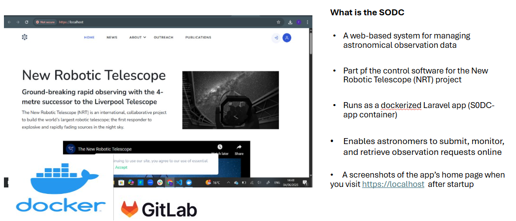 This project was a continuation of work from our 2024 intern Jamie Baxter. The goal was to develop automated tests which would allow the NRT software team to reduce manual test time on each software release for the Science Operations Data Centre which is currently in development as part of the LT phase 1 process. The previous project showed that by using the Laravel framework and artisan dusk components we can create tests which run when trying to merge new code to ensure other software features continue to work with the new changes.