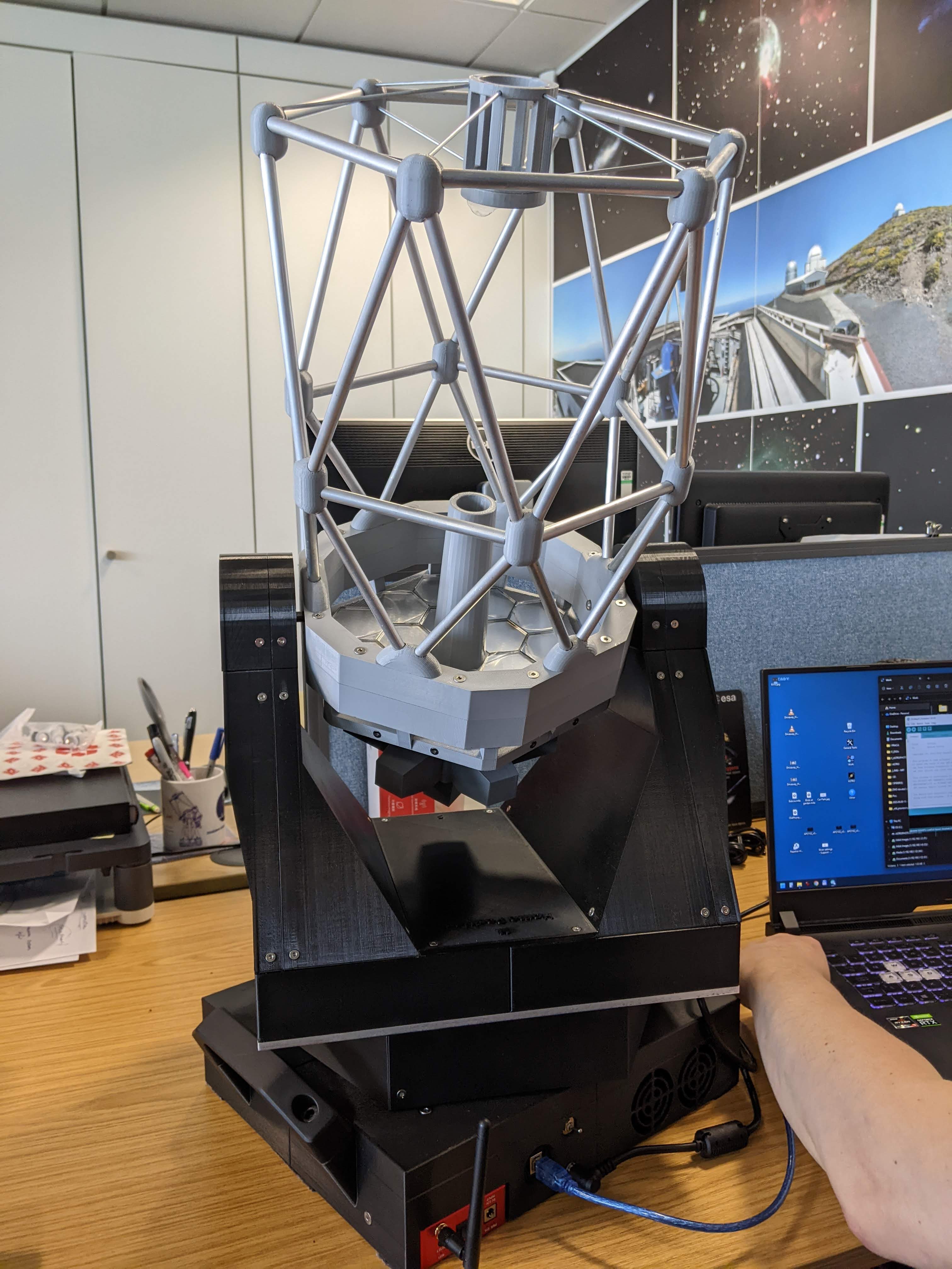 Martha has already built many impressive telescopes for personal use and this collaboration gave us an opportunity to create a scale model of NRT for outreach purposes. The project had a short duration (just 40 hours) to coincide with Martha's course and the objective was to develop a scaled NRT model (1:20); representative, cost effective and buildable using equipment we already had available to us. The NRT/LT labs have some impressive 3D printing capabilities so this was a good starting point for the main components. The NRT/LT lab has a Prusa MK3 for smaller parts and an Ultimaker S7 for larger, more complex parts. However, the base components required solid single pieces so these were printed at the LJMU engineering faculty workshop on their larger format 3D printers.