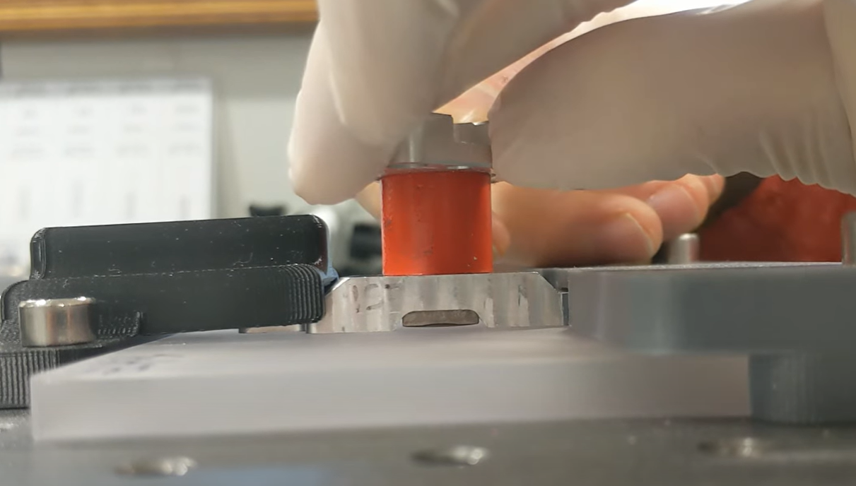 Using the freshly made jig part to position a pad during a gluing test - the jig and pad can be ultrasonically cleaned to remove dust, grease prior to gluing (unlike with the 3D printed PLA jigs)